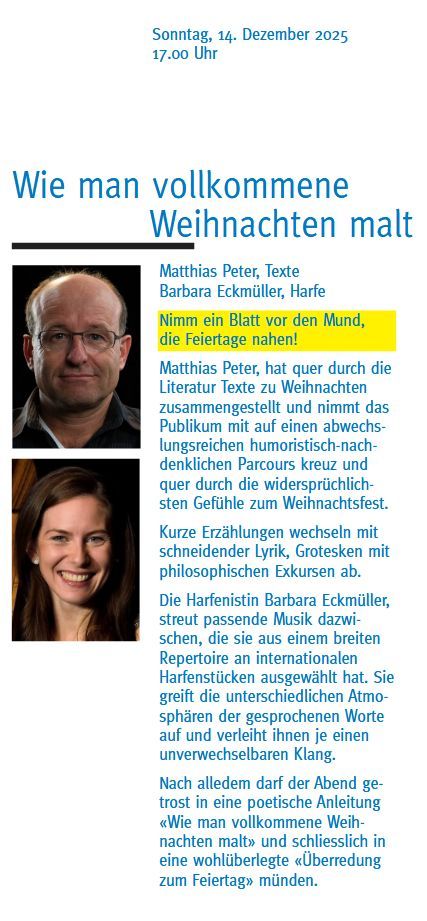 Nimm ein Blatt vor den Mund, die Feiertage nahen! Texte und Musik zu Weihnachten | Barbara Eckmüller, Harfe Matthias Peter, Texte | ||